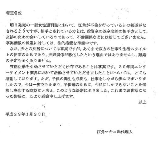 《私自身、芸能活動についてはこのほど引退させていただく所存です。30年エンターテイメント業界において 活動させていただきましたことについては、とても感謝しております。ただ、子供の誕生も成長も、 仕事をしながら歩んでまいりましたので、今は一度立ち止まり、子供達のために今、私にしかできないことを選択し 専念する時期だと考えました》