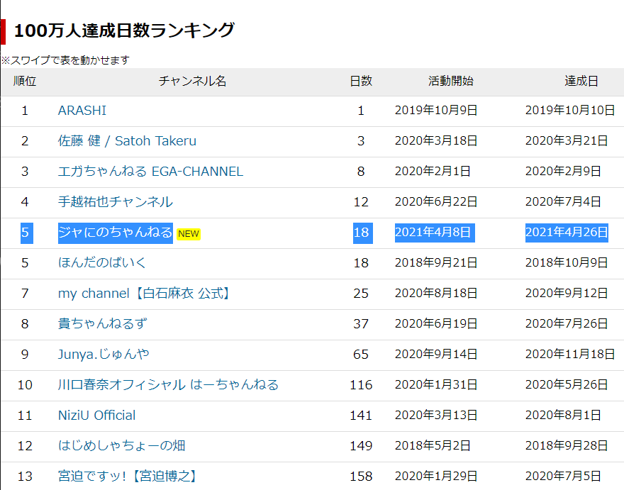 なお、100万人達成の記録としては