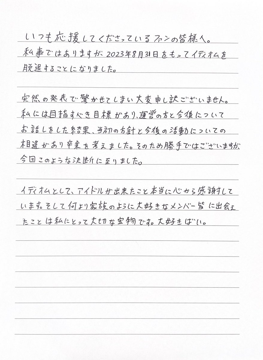 いつも応援してくださっているファンの皆様へ。突然の発表で驚かせてしまい申し訳ございません。長文ですが読んで頂けたら嬉しいです。