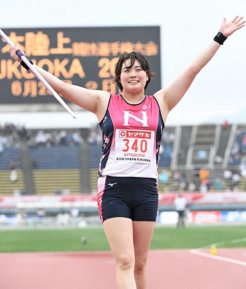 やり投の女子日本記録保持者。 オリンピック及び世界陸上競技選手権の陸上女子フィールド種目における日本人唯一のメダル獲得者。 北海道旭川市生まれ。3歳の時に水泳を始め、北海道教育大学附属旭川小学校時代には全国小学生バドミントン選手権大会で団体優勝を飾った(山口茜との対戦経験もある)。 北海道教育大学附属旭川中学校時代までは競泳とバドミントンの二足のわらじであり、競泳では全国大会にも出場した。 北海道旭川東高等学校進学とともにクラブ顧問の松橋昌巳(現:北翔大学コーチ)に誘われて陸上競技を始める。やり投を始めてわずか2か月で北海道大会を制覇し、2年生の時には全国高等学校総合体育大会陸上競技大会で優勝した。 2015年1月には、2020年東京オリンピック代表選手候補に期待される日本陸上競技連盟の「ダイヤモンドアスリート」に認定された。 2016年4月、日本大学スポーツ科学部競技スポーツ学科に入学。大学生として迎えた同年5月8日のゴールデングランプリ川崎(川崎市 等々力陸上競技場)では、日本歴代2位となる61m38を記録して3位。6月の日本選手権直前に右肘靱帯を損傷するも、翌年には痛みがなくなるまで回復した。 2017年9月の第86回日本学生陸上競技対校選手権大会(福井運動公園陸上競技場)では、最終6投目で60m49を投げて大会新記録を樹立して優勝した。 2019年5月の第6回木南道孝記念陸上競技大会(ヤンマースタジアム長居)では、4投目に63m58を投げて日本歴代2位を記録すると、続く5投目には海老原有希が保持していた63m80を50cmも更新する日本新記録・アジア歴代5位となる64m36を投げて優勝した。 同年6月の日本選手権では大会記録を更新する63m68を投げ、初優勝を飾った。秋には世界選手権に出場するも、ここではわずか6cm差で予選落ちに終わった。10月の北九州陸上カーニバル(北九州市立本城陸上競技場)で66m00を投げ日本記録を更新した。 2020年4月、日本航空に入社。 2021年8月3日、東京オリンピックの陸上競技・女子やり投(英語版)予選の1投目で62m06を記録し、6位で決勝進出を決める。 予選終了後から左脇腹に痛みが出て練習もままならず、痛みを押して6日の決勝に出場するも55m42の記録で12人中12位。佐藤以来の入賞とはならず、決勝後は笑顔の代わりに涙を見せた。 2024年のパリオリンピック・女子やり投では、8月7日の予選を1投目に通過ラインの62mを超える62m58をマークして余裕の通過。8月10日の決勝にて1投目で65m80をマークすると、ライバルが誰も北口の1投目を超えられず、自身の最終6投前に戴冠が決定し、金メダルを獲得した。オリンピックの陸上競技においての日本人による金メダル獲得は2004年アテネオリンピックの室伏広治(男子ハンマー投げ)と野口みずき(女子マラソン)以来5大会ぶり、マラソン以外での陸上女子種目では史上初となった。 選手情報 ラテン文字 Haruka Kitaguchi 国籍 日本 競技 陸上競技 種目 やり投・砲丸投 所属 日本航空 大学 日本大学 生年月日 1998年3月16日(26歳) 出身地 北海道旭川市 居住地 東京都 身長 179cm 体重 86kg |