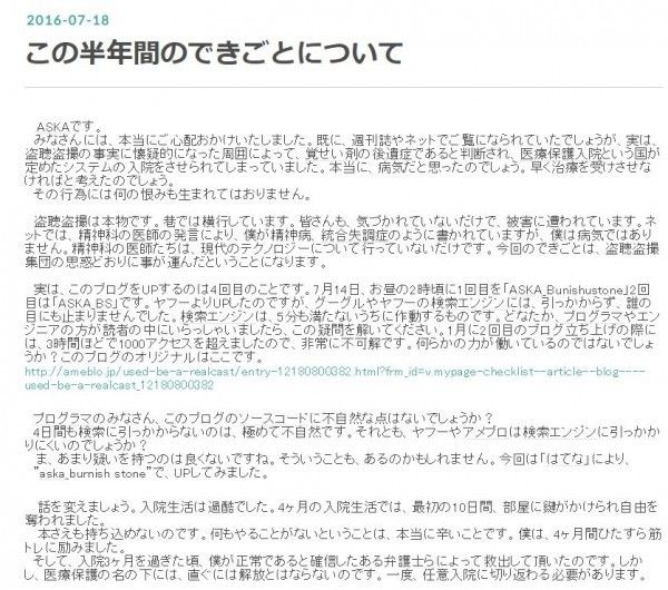 「aska_burnishstone’s diary」というブログが開設され「この半年間のできごとについて」というタイトルの記事がアップされたのは18日のことだった。
