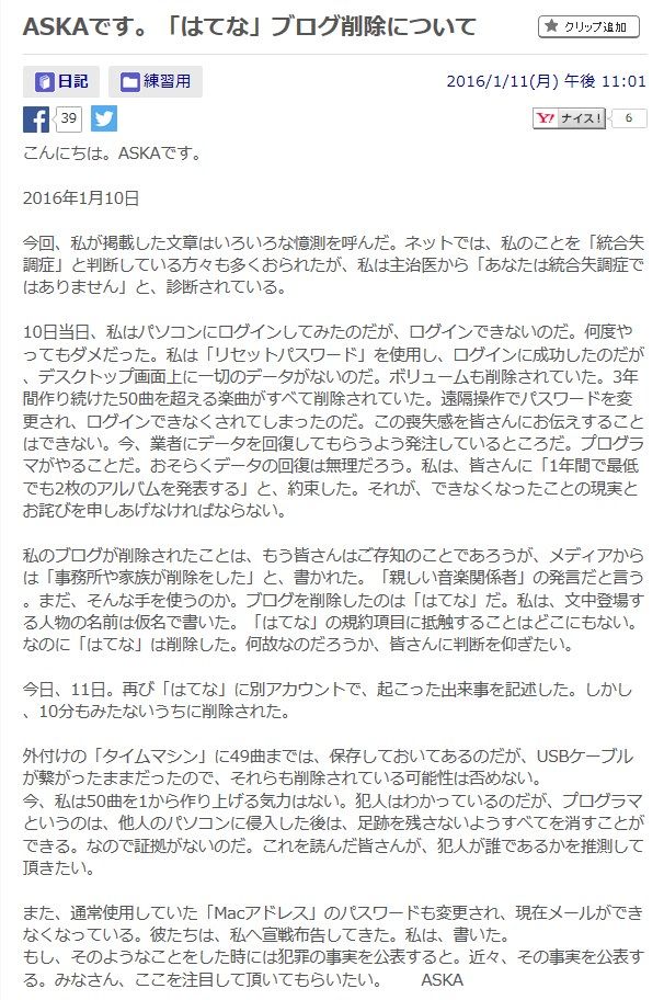 だが、当時のブログは数日のうちに削除されてしまった。ASKAは謎の盗聴盗撮集団により遠隔操作によって削除されたと主張しているが、実際は「ASKAに近い人たちが気付いて消したと聞いています」と音楽関係者。