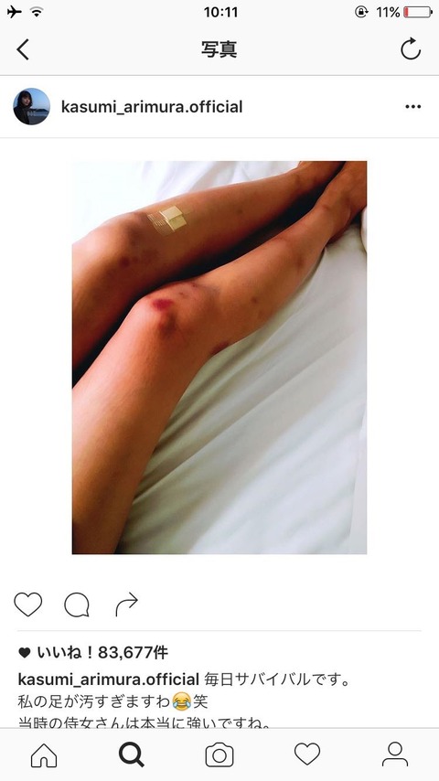 <有村架純>インスタで傷だらけの生足写真を公開!生々しい傷に心配&激励の声